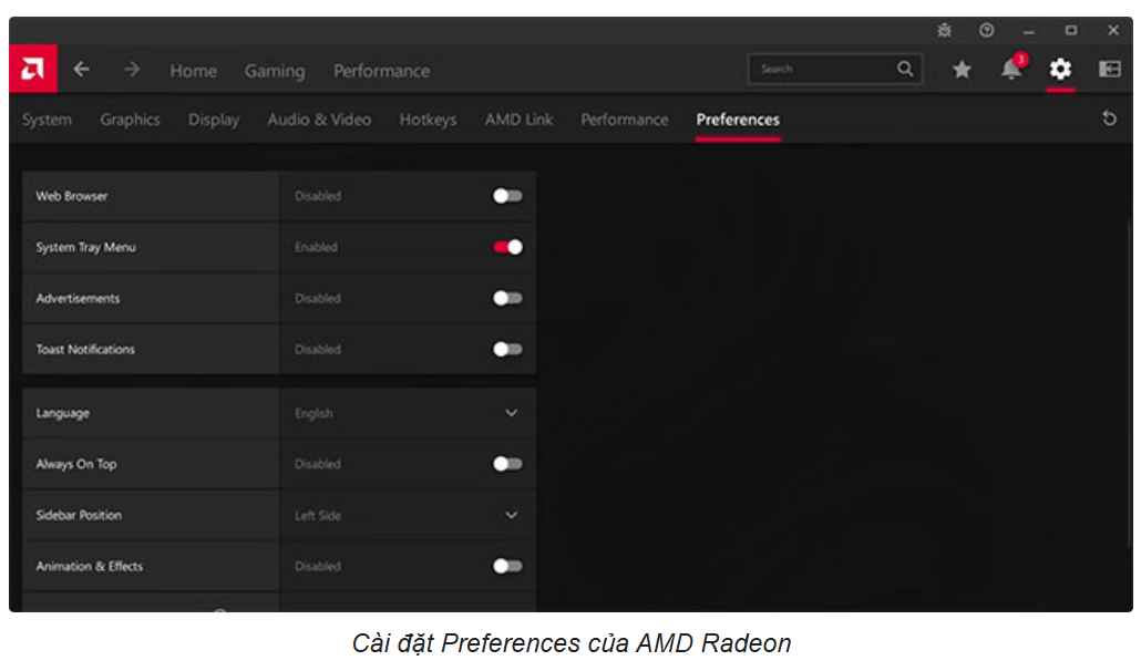 Phần Preferences trong phần mềm AMD Radeon cho phép bạn điều chỉnh các cài đặt liên quan đến sở thích cá nhân và hiệu suất hệ thống: