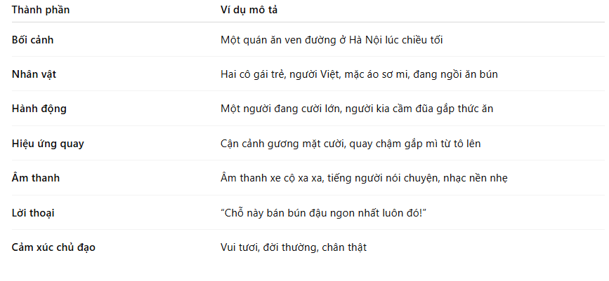 Một prompt Veo 3 hoàn chỉnh nên bao gồm: