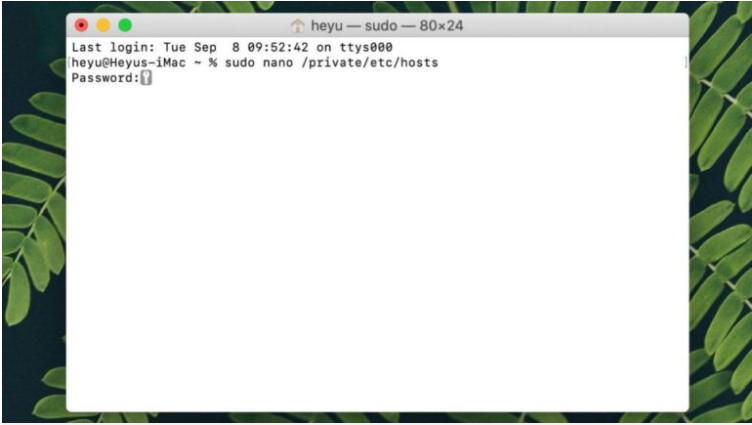 Bước 3: Nhập sudo nano /etc/hosts > Nhấn Enter > Nhập mật khẩu của bạn và nhấn Enter.
