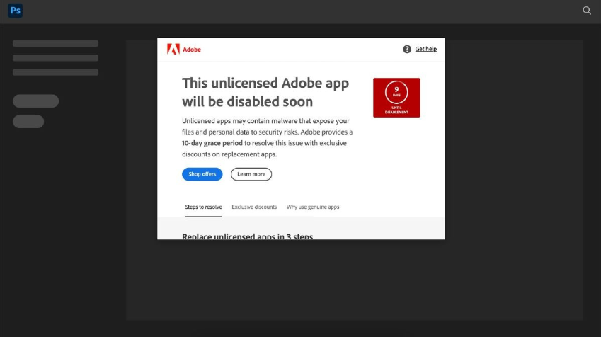 Lỗi này thường xảy ra nếu bạn đang sử dụng Photoshop bản crack không có bản quyền. Photoshop sẽ phát hiện ra và yêu cầu bạn mua ứng dụng có bản quyền hoặc cho bạn dùng thêm 10 ngày trước khi Adobe chặn hoàn toàn quyền truy cập của bạn vào ứng dụng.