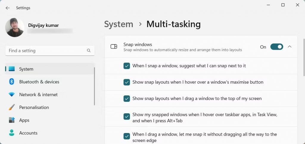 3. Trên trang tiếp theo, bật Snap windows.