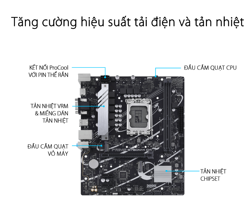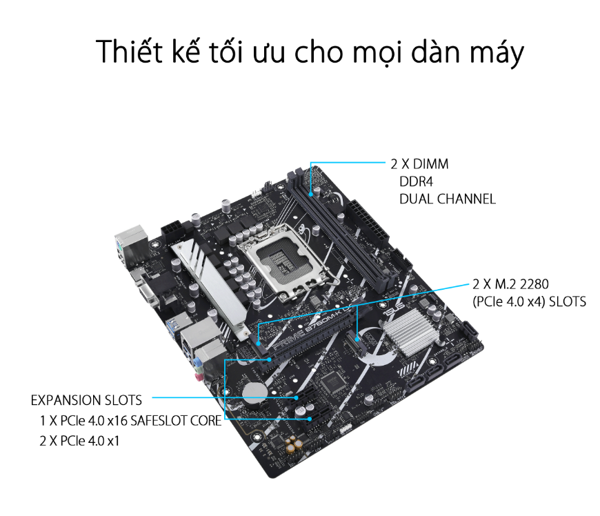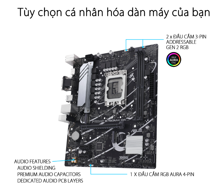 Khe cắm mở rộng | Intel® 13th & 12th Gen Processors 1 x PCIe 4.0 x16 slot Intel® B760 Chipset 2 x PCIe 4.0 x1 slots | |