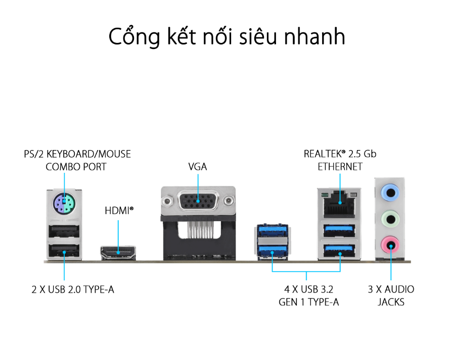 Cổng kết nối (Back Panel) | 4 x USB 3.2 Gen 1 ports (4 x Type-A) 2 x USB 2.0 ports (2 x Type-A) 1 x VGA port 1 x HDMI® port 1 x Realtek 2.5Gb Ethernet port 3 x Audio jacks 1 x PS/2 Keyboard/Mouse combo port | |