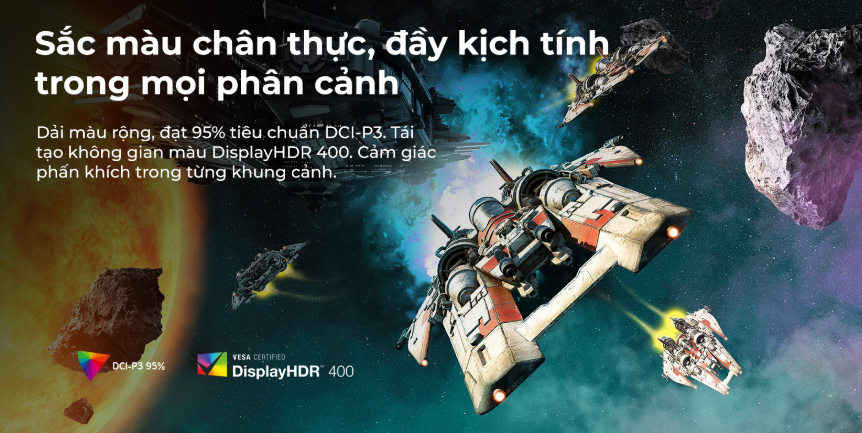 Độ sáng 400 nits cung cấp đủ lượng ánh sáng để người dùng xử lý tốt mọi công việc văn phòng cơ bản hay đồ họa nâng cao, chất lượng hình ảnh luôn ổn định ở mọi môi trường ánh sáng khác nhau. Nhờ dải màu cực rộng, đạt 95% chuẩn DCI-P3 (Dải màu điện ảnh kỹ thuật số). Tái tạo không gian màu DisplayHDR 400 giúp phấn khích trong từng khung cảnh bắt măt.