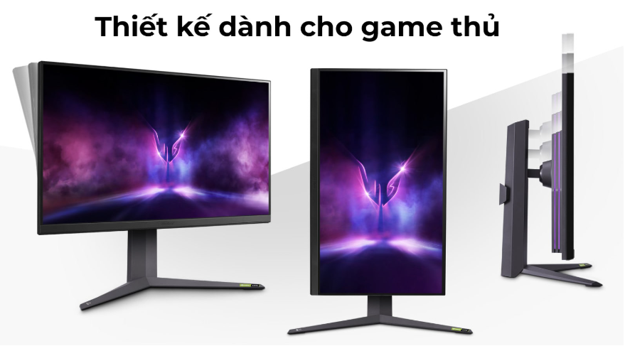 Chân đế hỗ trợ các chế độ tùy chỉnh nâng hạ, xoay dọc mang tới cảm giác trải nghiệm trọn vẹn. Mặt sau hỗ trợ ngàm treo màn hình tiêu chuẩn VESA 100x100mm, giúp màn hình linh hoạt trong việc tối ưu không gian sử dụng.