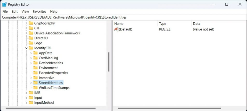 - Trong cửa sổ Registry, đi tới Computer > HKEY_USERS > DEFAULT > Software > Microsoft > IdentityCRL > StoredIdentities.