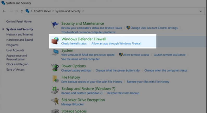 - Trong cửa sổ Control Panel, chọn System and Security > Windows Defender Firewall.
