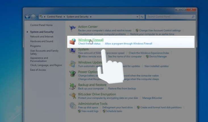 - Trong cửa sổ Control Panel, chọn System and Security và sau đó chọn Windows Firewall.