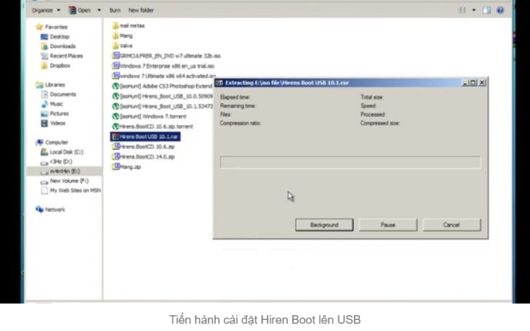 - Cài đặt Hiren Boot lên USB: Cắm USB vào máy tính và format theo chuẩn FAT32. Sau đó, sử dụng Grub4dos Installer để tạo khả năng boot cho USB. Tiếp theo, giải nén Hiren BootCD và sao chép các file vào USB.