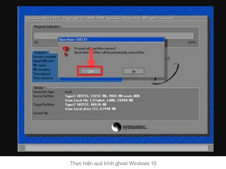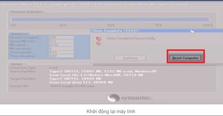 - Hoàn tất quá trình ghost: Chờ quá trình ghost hoàn tất và khởi động lại máy tính.