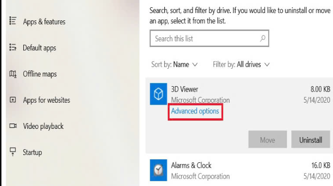 Click chuột vào một ứng dụng, nếu thấy dòng Advanced options xuất hiện, ứng dụng đó hỗ trợ tính năng Reset và Repair.